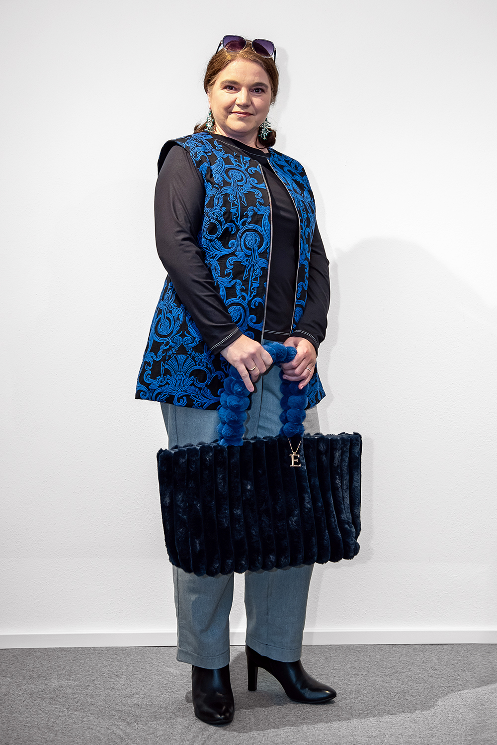 Royalblau-schwarze Baumwollweste aus festem Jacquardstoff mit silbernem Metallreißverschluss. Die Weste geht von der Länge über die Hüfte und ist besonders gut kombinierbar mit warmen dicken Hosenstoffen wie z.B. Jeans, Cord- oder Samt.